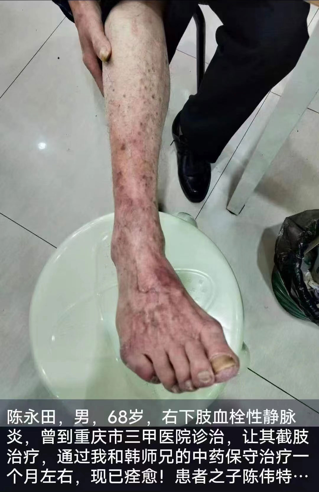 静脉栓塞炎,不能走路,医院要截肢手术,后来采用中药治疗,吃了一半个月,脚就可以走路,继续服用一个多月脚就有知觉,有温度,气血就可以循环